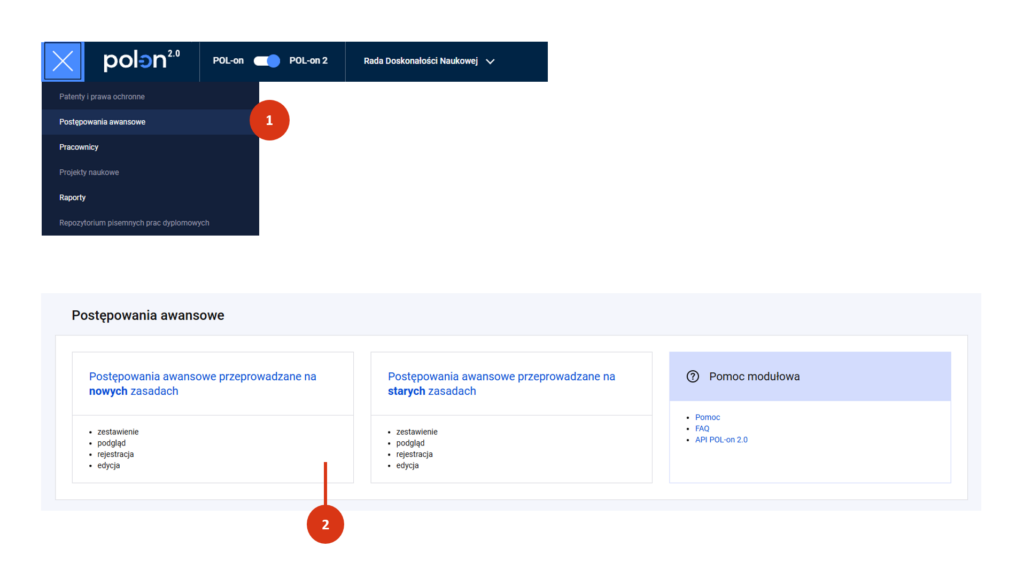 Aby zarejestrować postępowanie o nadanie stopnia doktora zaloguj się do POL-on 2.0. Wybierz z menu moduł Postępowania awansowe [1]. Następnie wybierz kafel „Postępowania awansowe przeprowadzane na nowych zasadach” [2].