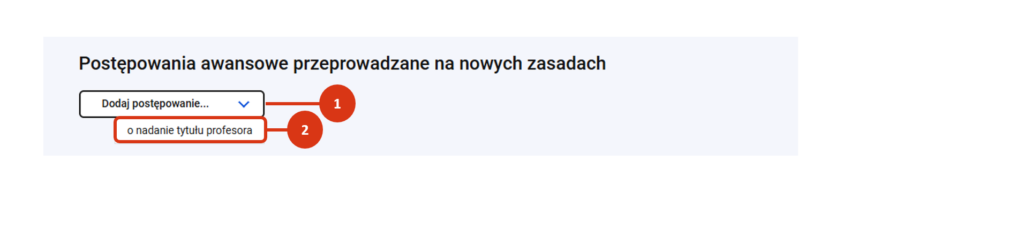 Kliknij w przycisk „Dodaj postępowanie…” [1] i wskaż ścieżkę postepowania o nadanie tytułu profesora [2].