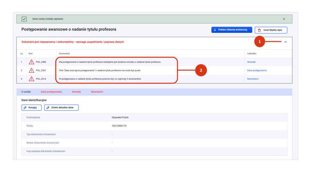 Po zapisie formularza dane postępowania zostaną wyświetlone w zakładkach. W zakładce „O osobie” znajdziesz dane identyfikacyjne i osobowe osoby ubiegającej się o tytuł profesora. Informacje o dziedzinie i dyscyplinie, w której osoba ubiega się o tytuł znajdziesz w zakładce „Dane postępowania”.