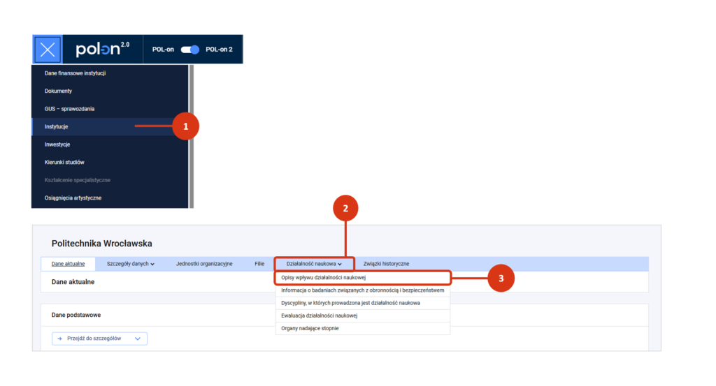 Aby zapoznać się ze stanem przygotowania do ewaluacji opisów wpływu działalności naukowej zaloguj się do POL-on, wybierz moduł Instytucje [1], a następnie zakładkę „Działalność naukowa” [2] i „Opisy wpływu działalności naukowej” [3].