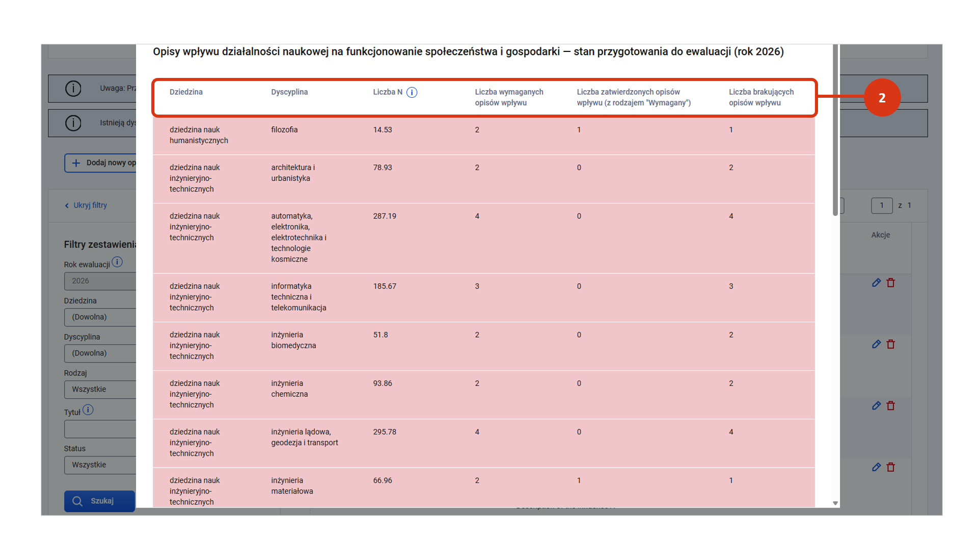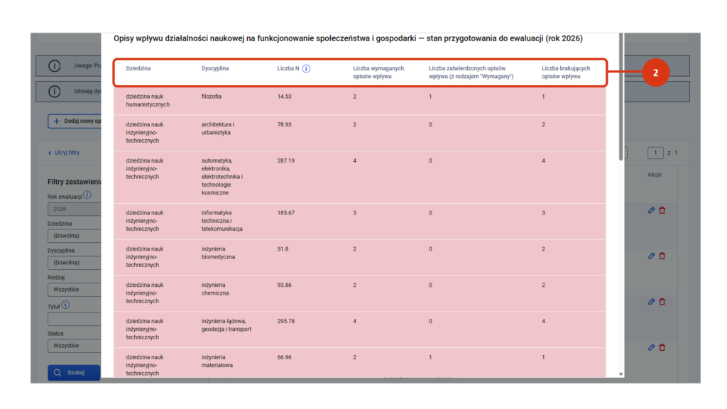 Do momentu uzupełnienia opisów wpływu do wymaganej liczby nad zestawieniem opisów wpływu system będzie wyświetlał ci komunikat z informacją: „Istnieją dyscypliny, dla których nie wprowadzono wymaganej liczby opisów wpływu. Prosimy o sprawdzenie stanu przygotowania opisów wpływu do ewaluacji” [3].