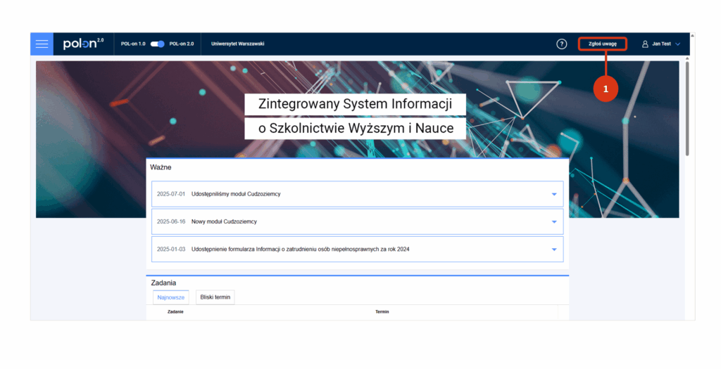 Kliknij w przycisk „Zgłoś uwagę” [1], a następnie „Nowe zgłoszenie” [2].