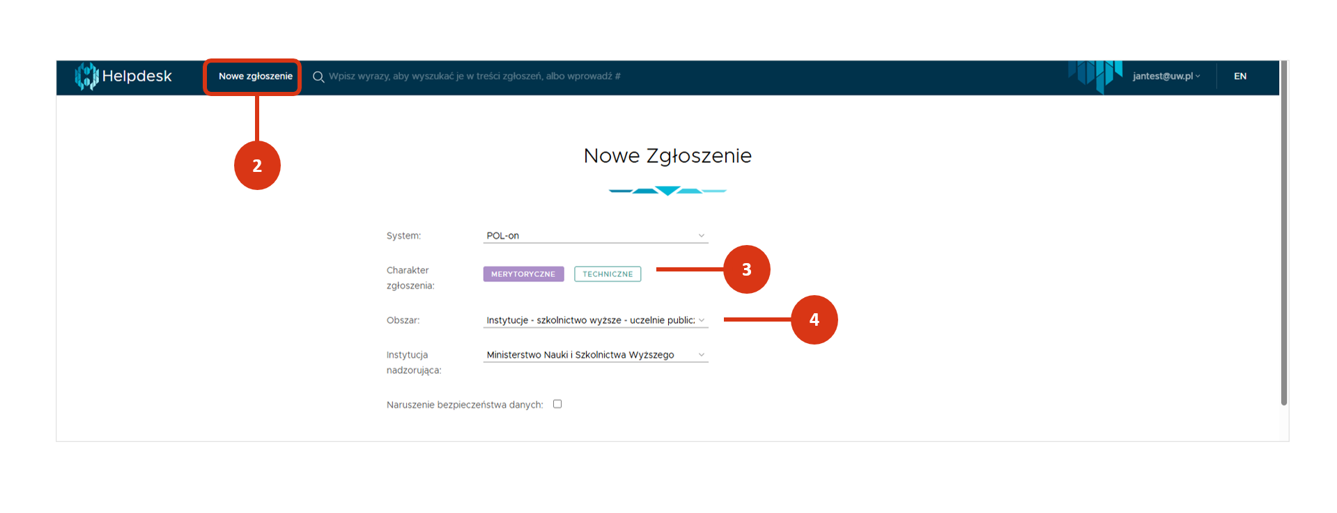 Sprawdź czy wskazany w zgłoszeniu system to POL-on. Wybierz merytoryczny charakter zgłoszenia [3], a następnie wskaż właściwy obszar w zakresie instytucji [4].
