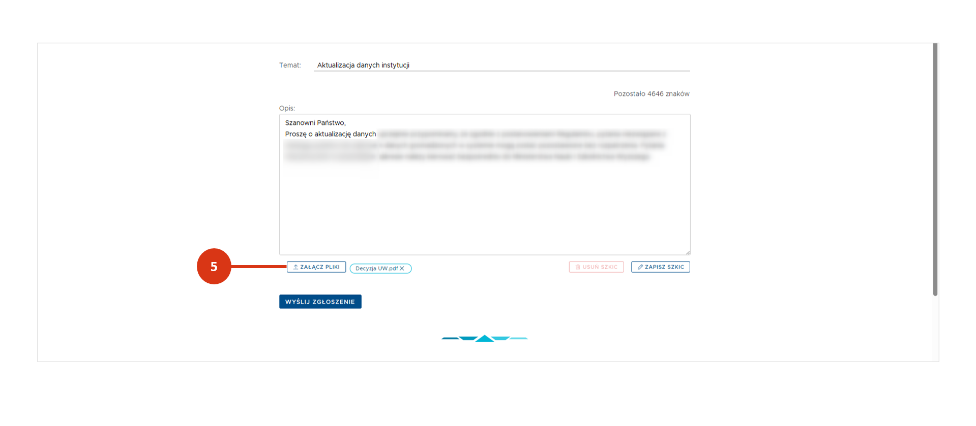Upewnij się, że w zgłoszeniu wprowadzono właściwą nazwę instytucji nadzorującej. Wprowadź temat i opis. W razie potrzeby dołącz pliki z dokumentami uzasadniajacymi zmianę danych [5].